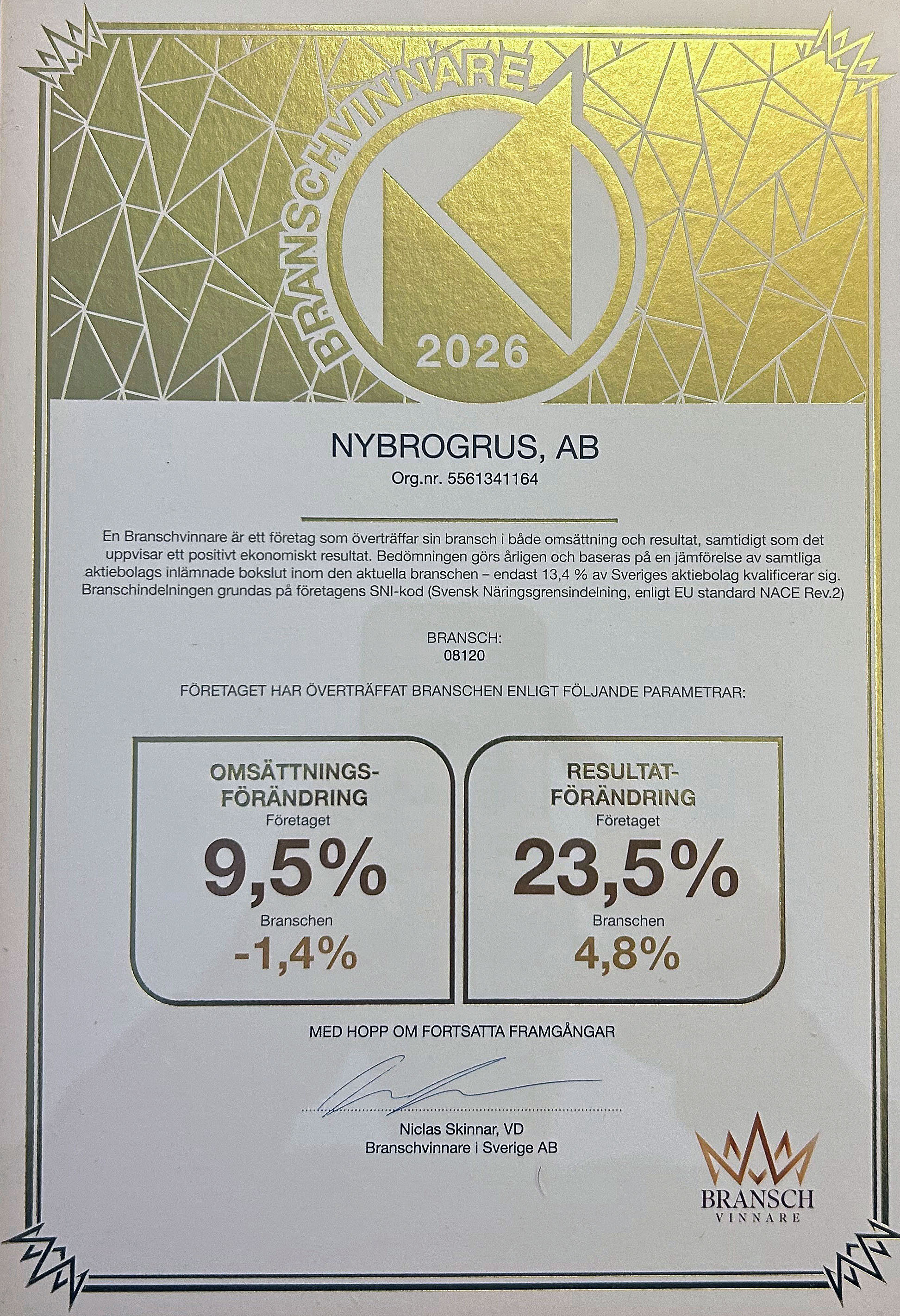 Vi är stolta och glada över att meddela att Nybrogrus AB även i år har utsetts till Branschvinnare 2026. Utmärkelsen delas ut till företag som visar stark tillväxt, stabil lönsamhet och hög kvalitet i sin verksamhet – och att få den igen är ett kvitto på vårt långsiktiga arbete och engagemang.